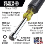 Klein has the nut drivers professionals demand to get the job done. The full hollow shaft facilitates work on stacked circuit boards or other long bolt applications. Premium chrome-plated for smooth feel and corrosion resistance. The handle end is color coded for easy identification. The patented Tip-Ident quickly identifies nut driver and size. For more than 160 years, Klein Tools has manufactured premium-quality, professional-grade hand tools that deliver the performance, durability and precision needed to get the job done right. Our family of engineers, workers and craftsman continue to put six generations of expertise into every tool we create by using only the highest quality materials, superior workmanship, and keeping manufacturing as close to home as we can. Klein isn’t just the name of our company, it’s also our family name. And since we’re an American company that’s family-owned and family-run, you know you can count on us to be here tomorrow. Klein Tools doesn’t just make great products, we make great products that stand up to the demands of the professionals who use them every day … Since 1857