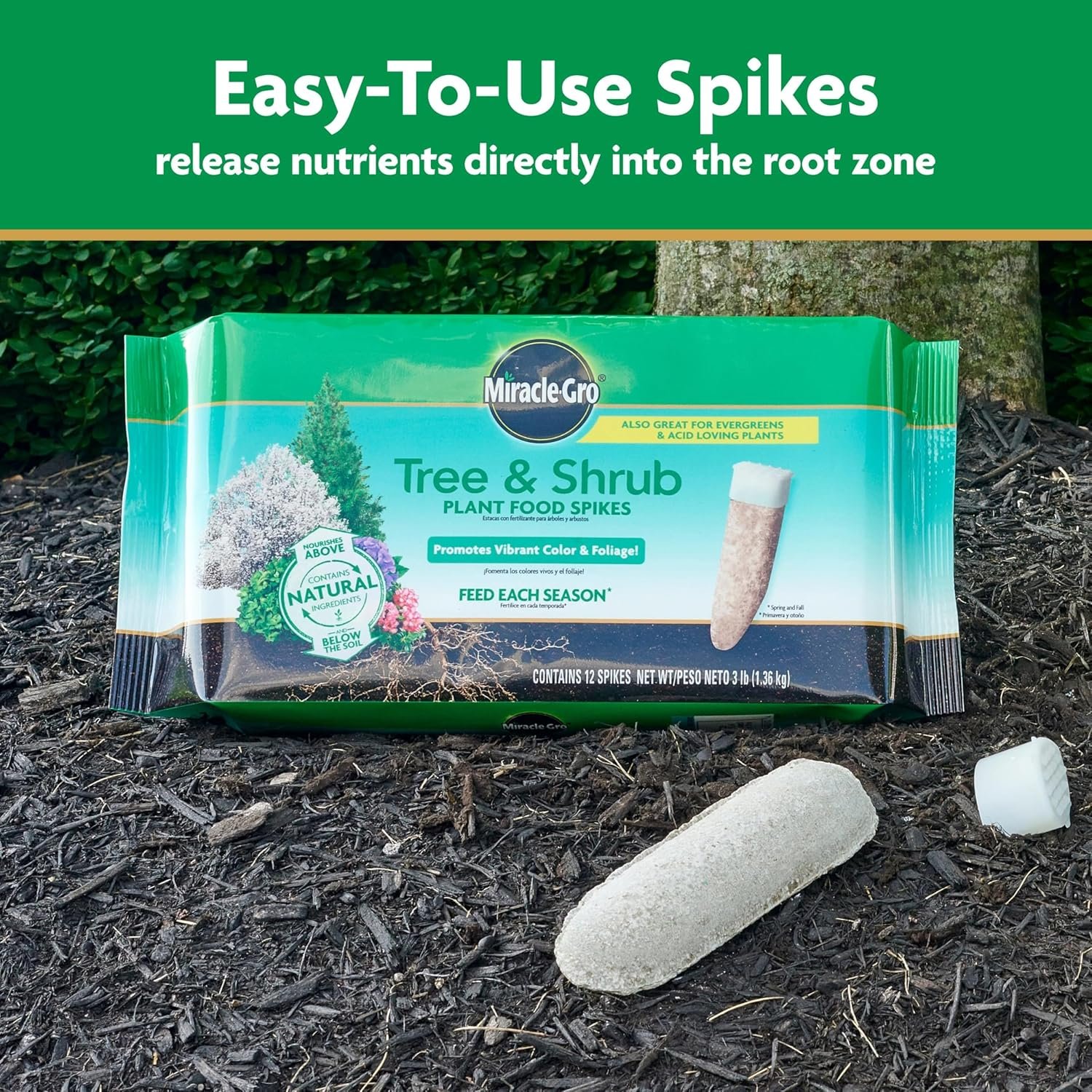 - Coverage: This package includes 12 Miracle-Gro Tree & Shrub Plant Food Spikes, enough to feed 3 trees with a 4-ft drip line diameter or 1 tree with a 12-ft. drip line diameter