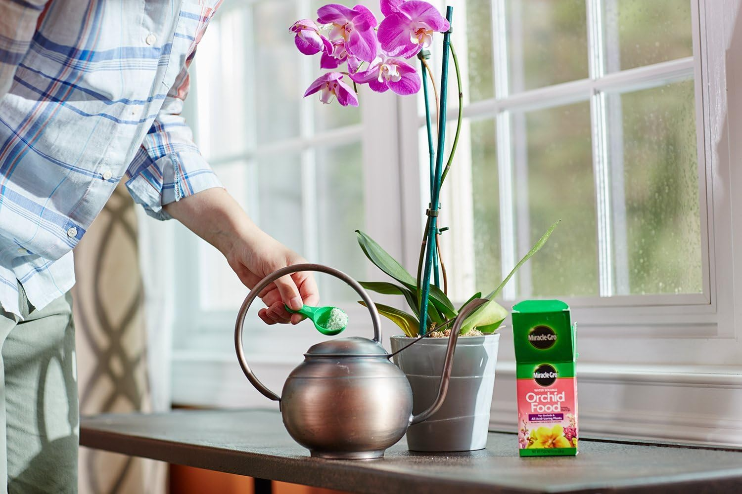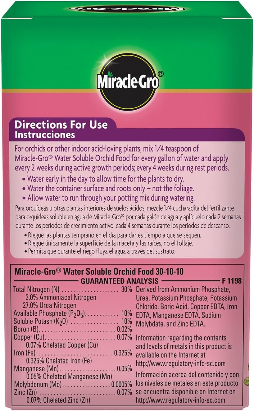 Miracle-Gro Water Soluble Orchid Food is a great way to nurture orchids and other acid-loving plants. It gives plants a deep, rich leaf color, beautiful blooms, and strong roots. Apply it every 2 weeks during active growth periods and every 4 weeks during rest periods. Grow a colorful, beautiful orchid with Miracle-Gro Water Soluble Orchid Food.